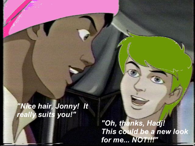 * A sequal to "Jonny's Ultimate Vengeance" Hadji's Revenge It had been many months since Jonny's little joke on Hadji-- a harmless little prank, but one that was humiliating and had the whole family laughing at his expense. Hadji thought Jonny's idea of dying his turban pink was original, but he didn't appreciate the prank, and even though Hadji didn't believe in vengeance, he felt that Jonny needed a lesson. He had been biding his time, waiting patiently-- going over idea after idea, until he finally had the perfect one. It was the weekend of Jonny and Benton's annual fishing trip. Jonny would be gone for two days, he would come home in the early morning, and he would be tired and unsuspecting when he came in. This gave Hadji the time he needed to act. Jessie and Hadji were sitting with Race on the sofa watching TV. Hadji did not know it, but he had a small grin on his face that highly uncharacteristic, and Jessie could not help but notice. "Hadji?" she asked with a quizical grin, "What's up?" "Hmm? Pardon?" "You have a grin on your face, like you're contemplating something. What's on your mind?" Hadji smiled. "You remember Jonny's practical joke?" Jessie through her head back and started laughing. "How could I...forget... pink..." she gasped. Race was stifling laughter under his breath. "So what are you going to do?" asked Jessie. Hadji grinned a sly grin. "You will see. I will tell you this much-- this challenge will be how to slip it in to his shampoo without it affecting either the appearance or performance of it." Jessie's expression changed to one of grave seriousness. "Hadji, not hair remover..." "Oh, no, Jessie! That would be too cruel! But I promise you, he will think twice before pranking me again. Especially someone with a background not only in chemistry, but herbology as well." With that, Hadji left them to persue his "work". ***************** Early Monday morning, Benton and Jonny rolled in at about 5 am. Jonny showered as usual, and noticed nothing strange either in the shower, or immediately after he got out of the shower. Jonny got out and got dressed as usual, albeit he was moving at a very sluggish pace-- all a part of Hadji's plan, as his concoction had a latent effect. Jonny went down to breakfast as usual. He came into the dining room and sat down, and as he made his entrance, the eyes of all in the room became as large as saucers. Jessie started to snicker. "Wh-what?" yawned Jonny. Benton looked at Race. "Excuse me." said Benton, with a look of rememberance in his eye. Benton walked into the kitchen and lost it. Race put his hand over his mouth and his snickers kept grwoing louder and louder. Hadji folded his arms and leaned back in his chair, with a large smile of satisfaction spread across his face. "Wha-- what? What's so funny?" By this time, Benton contained himself long enough to re-seat himself. "Um, Jonny, have you looked in the mirror?" asked Benton. "This morning, as usual when I was brushing my hair. Why?" "Dr. Quest, the solution has a latent effect." commented Hadji. Jonny shot Hadji a look. "What solution?!?" Hadji bent over under the table for a second, and when he bent back up, had his pink turban wrapped around his head, re-sparking laugher around the room. Jonny's mouth dropped, and a look of panic spread across his face. Jessie left the table briefly, and came back down with her hand mirror. "You see, my friend, I told you I would get you back." "Yeah, but I never thought you meant it... what did you do?" "Um, Jonny, your hair..." snickered Jessie. "My HAIR?!?" Jessie tried to stifle her snickers as she handed Jonny her mirror. "Oh, my GOOODDD!!!" screamed Jonny as he took his hand and patted the stiff pea-green spikes that were his hair. "Oh, Jonny-- I never you were a closet punk rocker!" teased Jessie. "It's you! It's yewwwwwwww!!!" "Uh, Hadji-- is this... this..." "No, my friend. It will wash out. In about a week." "A WEEK!!! YOU MEAN I HAVE TO GO AROUND LIKE THIS FOR A WEEK??!!???" By this time, the family was all but rolling in the floor. "Oh, I have a solution." laughed Hadji. "What!" snapped Jonny. Hadji took off his pink turban and handed it to Jonny. "You have a choice: either green, or PINK!"